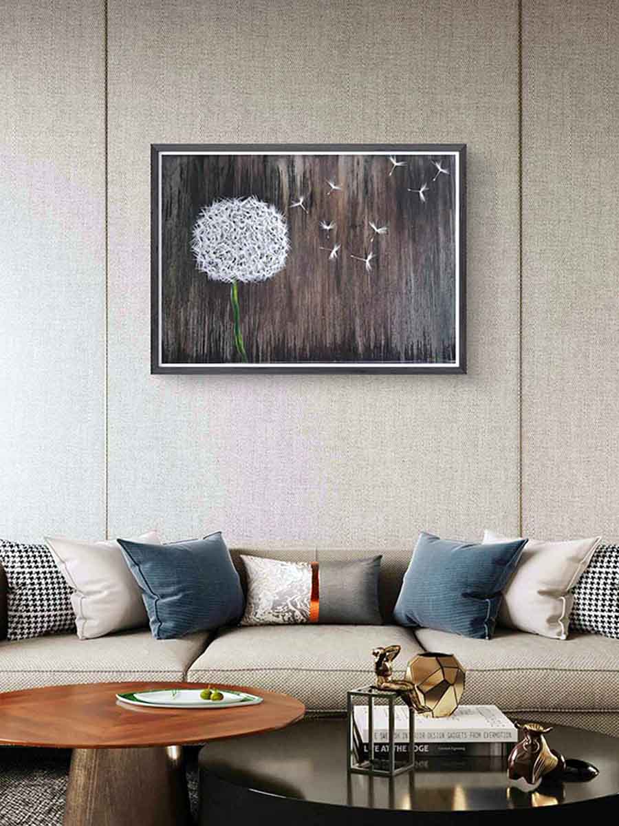 Na tamnoj pozadini, bela kruna maslačka tiho sija —