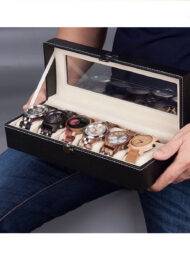 Kutija kao dodatak vašoj kolekciji satova, dostupna je u crnoj i beloj boji, ima šest pregrada koje su idealne za organizaciju i čuvanje vaših satova. Elegantna kutija je urađena od visokokvalitetnog materijala i mekane unutrašnjost koja štiti satove od ogrebotina i oštećenja. Svaka pregrada ima svoj namenski jastučić za sat. Sa fenomenalnom ručnom izradom i sofisticiranim dizajnom, ova kutija je savršen za poklanjaje, putovanja i čuvanje satova u stilu.