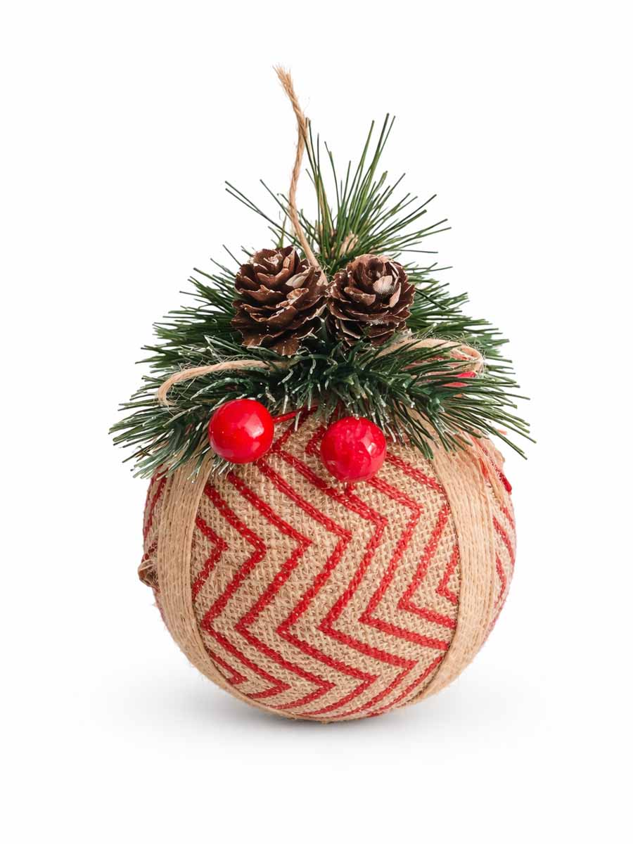 Novogodišnja kugla od prirodne jute sa crvenim dekorativnim detaljima, šišarkama i zelenilom. Čvrsta, lagana i jednostavna za kačenje, idealna za jelku i rustične praznične aranžmane. Ručno pravljena.