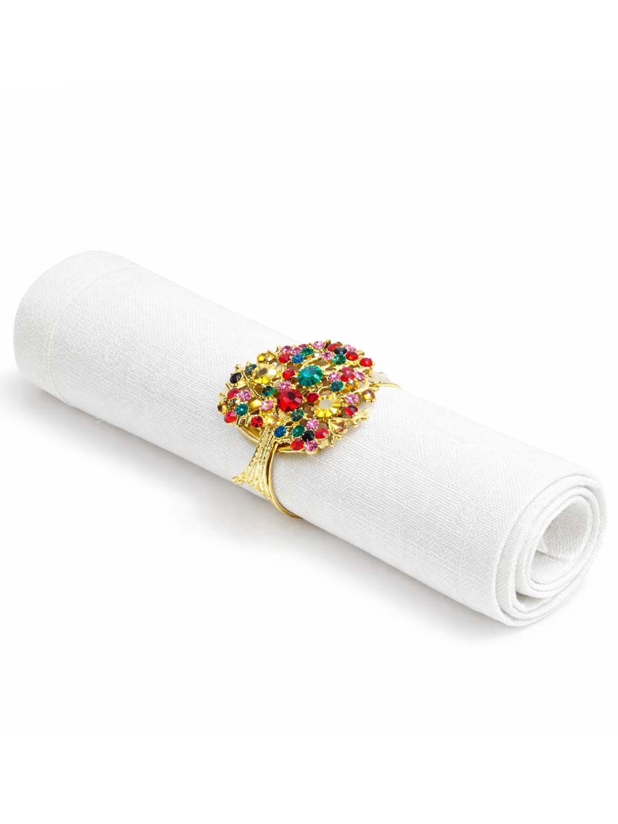 Prsten za salvetu u obliku krošnje simbolizuje život, rast, obilje i povezanost. Bogato ukrašena krošnja, ispunjena sjajnim detaljima u raznim bojama, predstavlja plodnost, radost i toplinu zajedništva, što ovaj prsten čini savršenim dodatkom za svečane trpeze, slave i posebne prilike. Zlatna osnova daje mu sofisticiran i luksuzan izgled, dok razigrani elementi unose dozu vedrine i elegancije. Idealan je za dekoraciju prazničnih stolova, svečanih ručkova i večera, gde simbolika krošnje dodatno naglašava značaj okupljanja i deljenja lepih trenutaka.