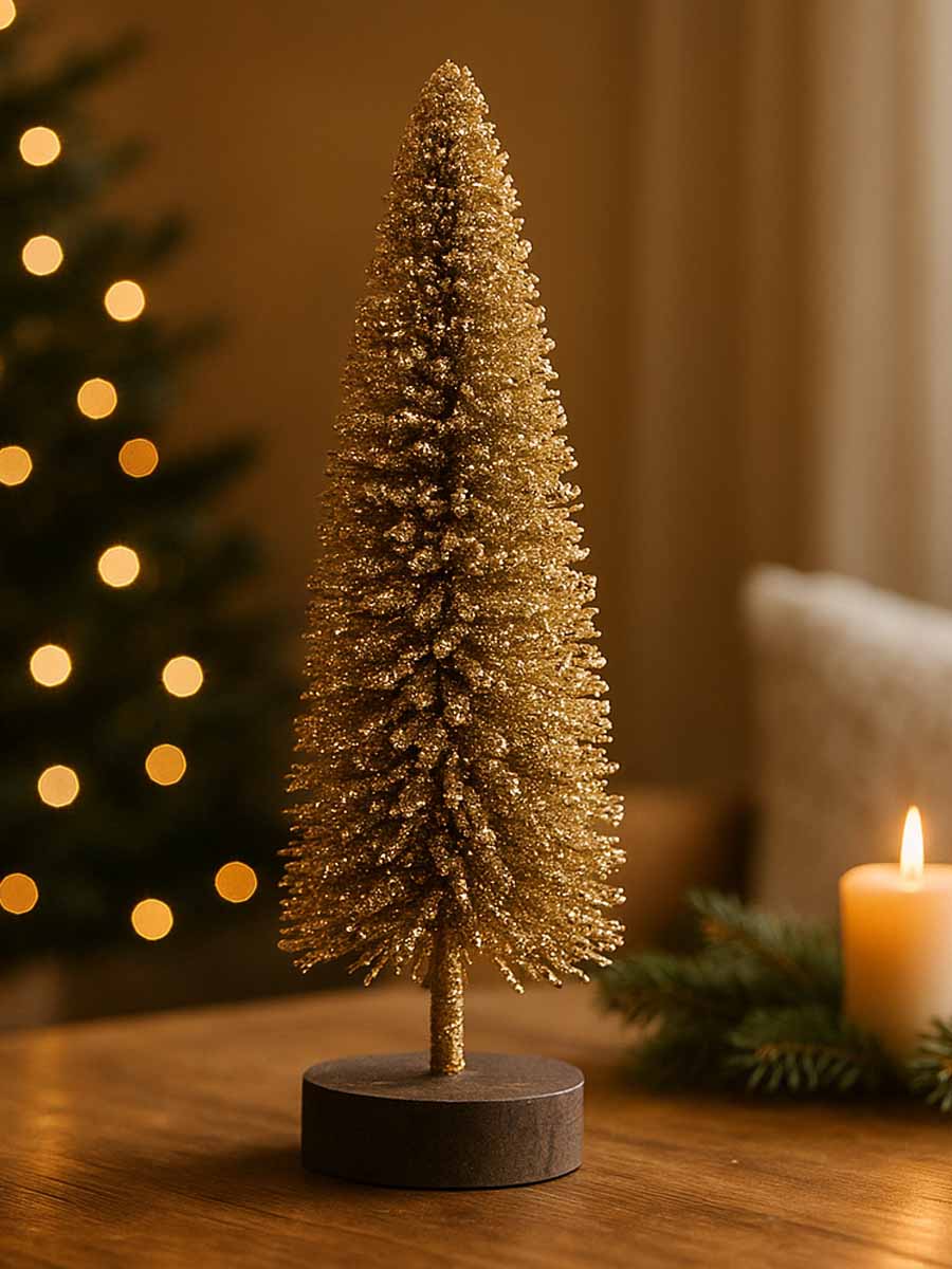 Zlatna jelka daje suptilan sjaj praznika u minimalističkoj formi. Ručno izrađene grane od žice i postolje od drveta čine ovu jelku savršenim detaljem koji donosi toplinu i blistavost svakom prostoru.